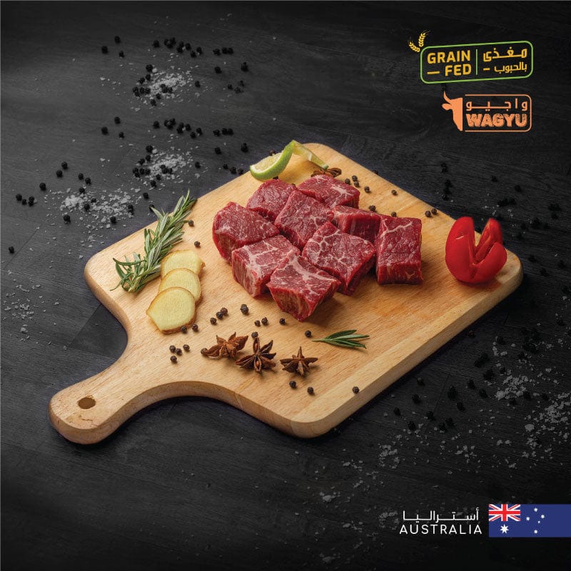 250gm, 500gm or 1kg packet of fresh Australian Grain-Fed Wagyu beef cubes for a flavourful experience. 100% hormone and antibiotic-free. All our products are 100% Halal.